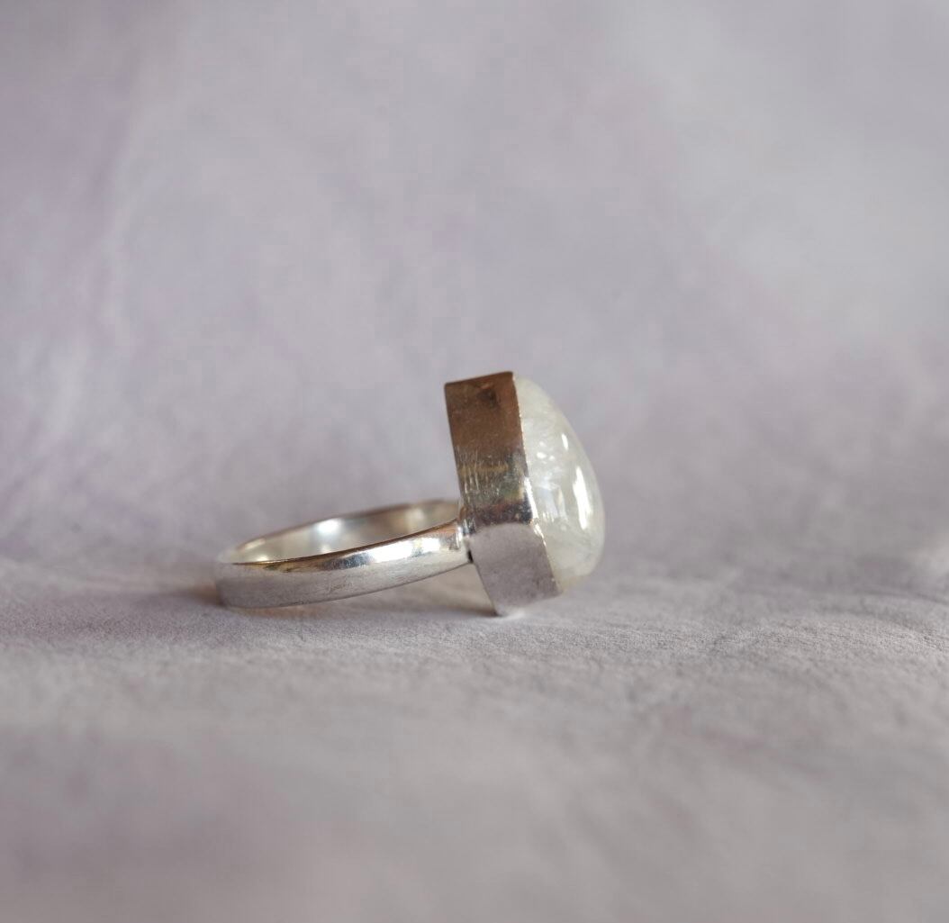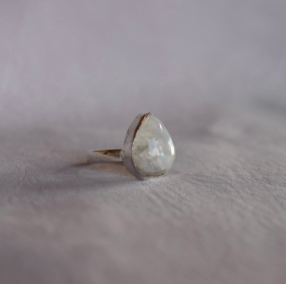 揺れる星屑を閉じ込めたような、神秘的な輝きが魅力的なブルームーンストーンリング。ぽってりとしたなみだ形は手元を華やかにしてくれます。