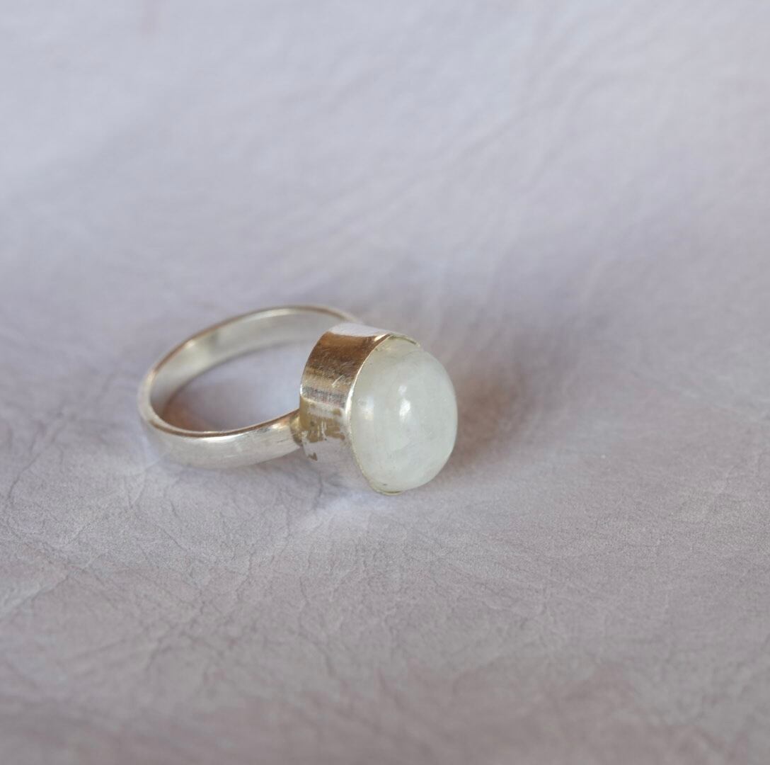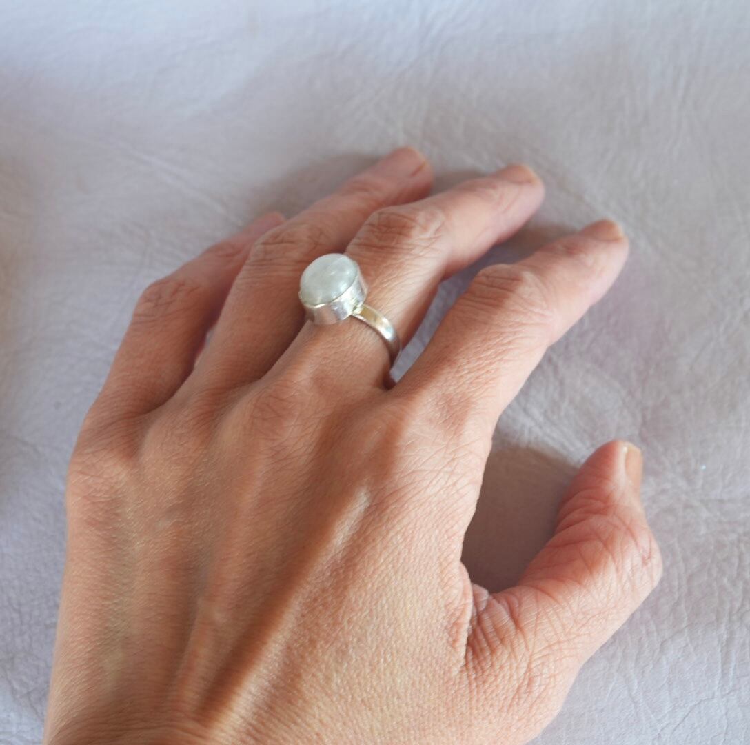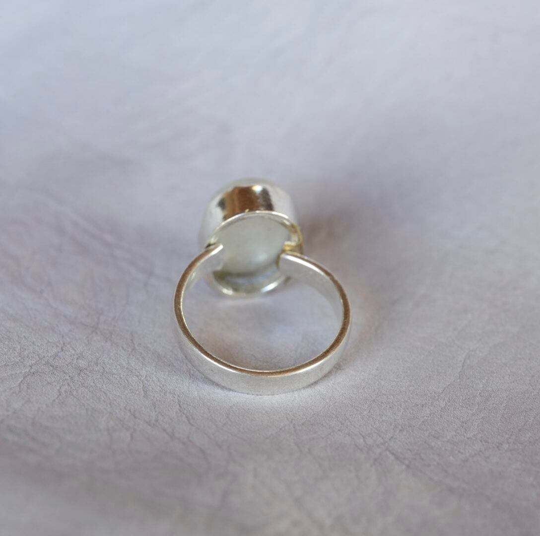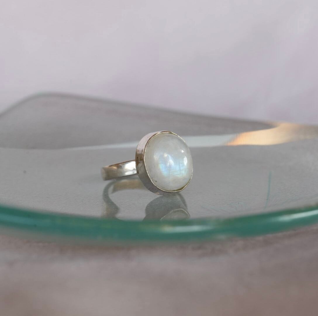 揺れる星屑を閉じ込めたような、神秘的な輝きが魅力的なブルームーンストーンリング。ぷっくりと愛嬌のあるオーバルデザインです。角度によってブルーの輝きが見られます。いろいろな角度から異なる表情をお楽しみいただけます。