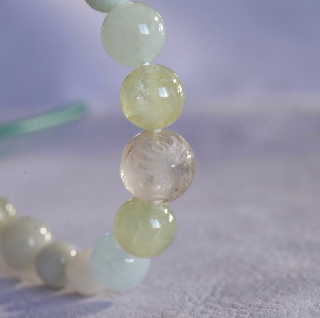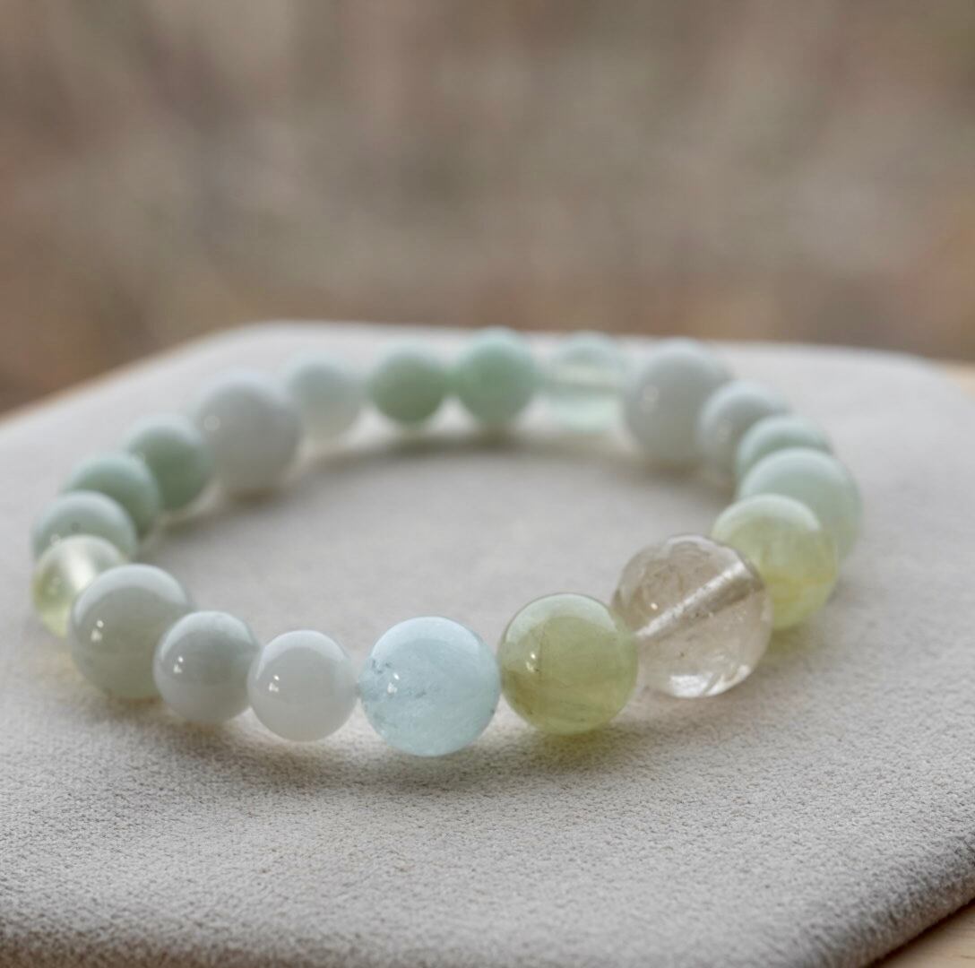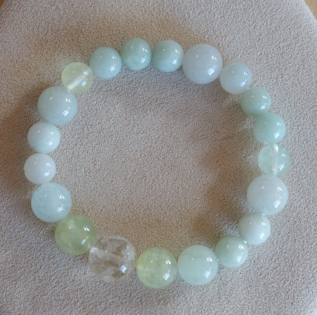 やわらかな翠色の翡翠に、涼やかな淡い緑のグリーンベリル、プレナイトの組み合わせで癒しカラーのブレスレットになりました。