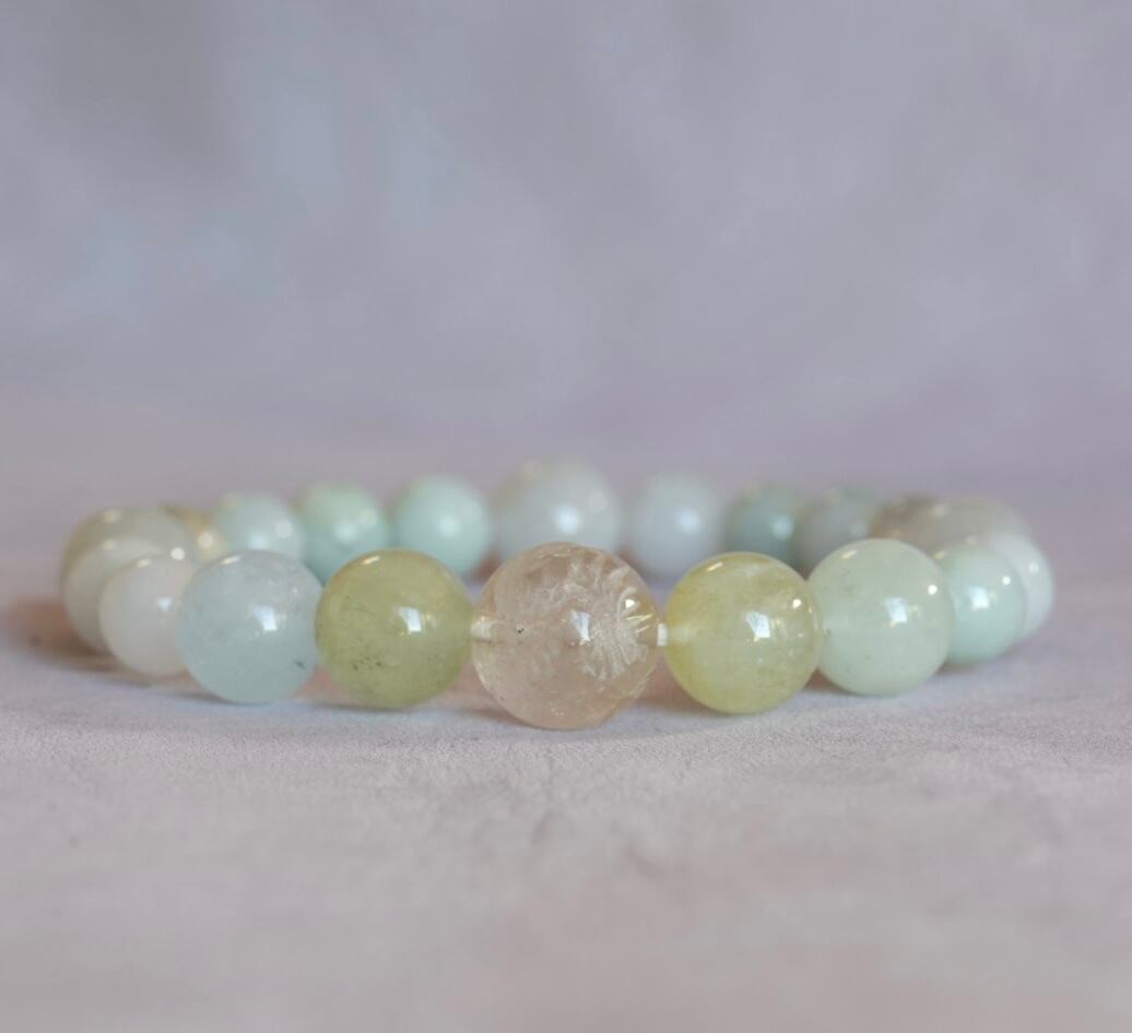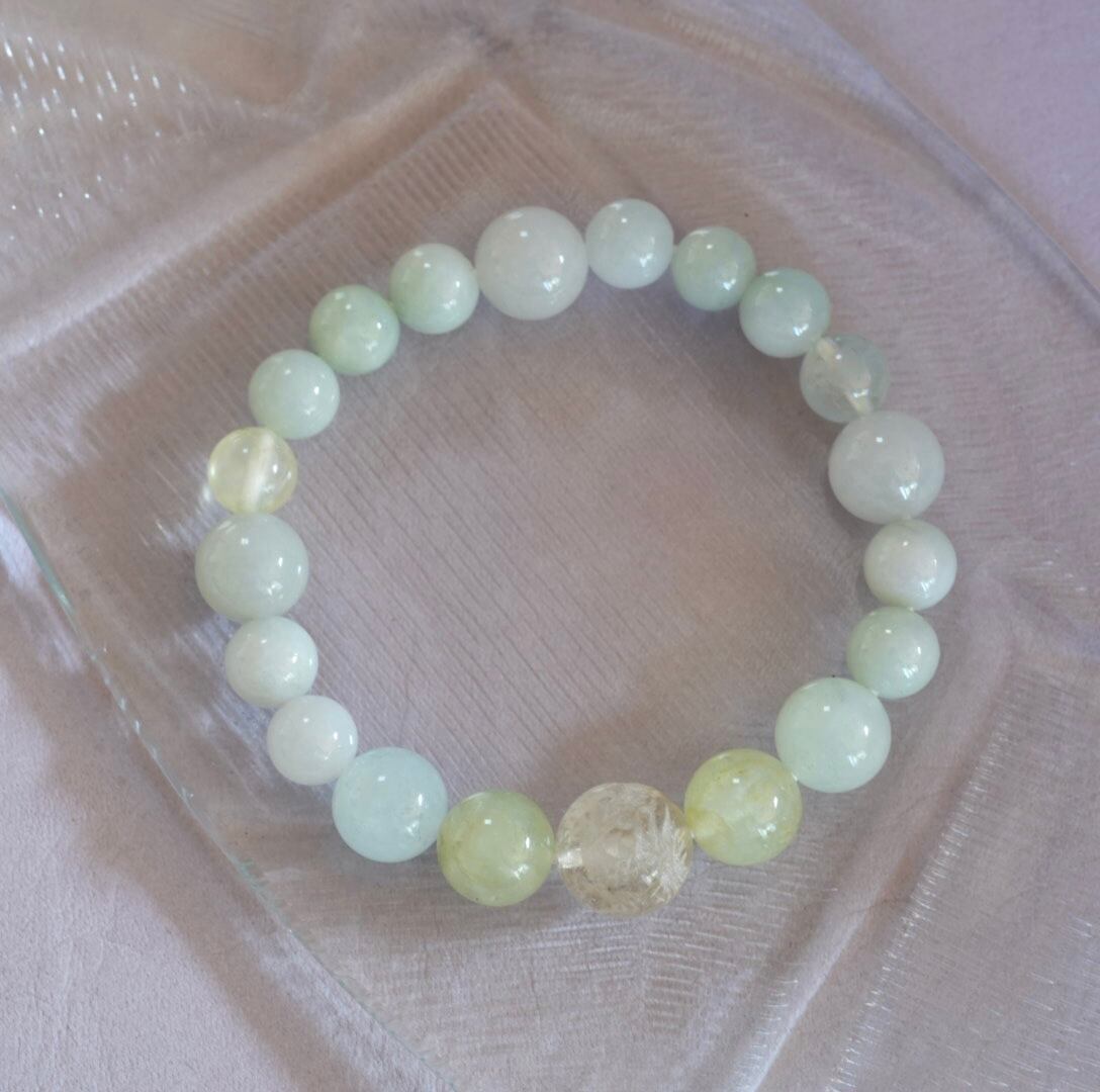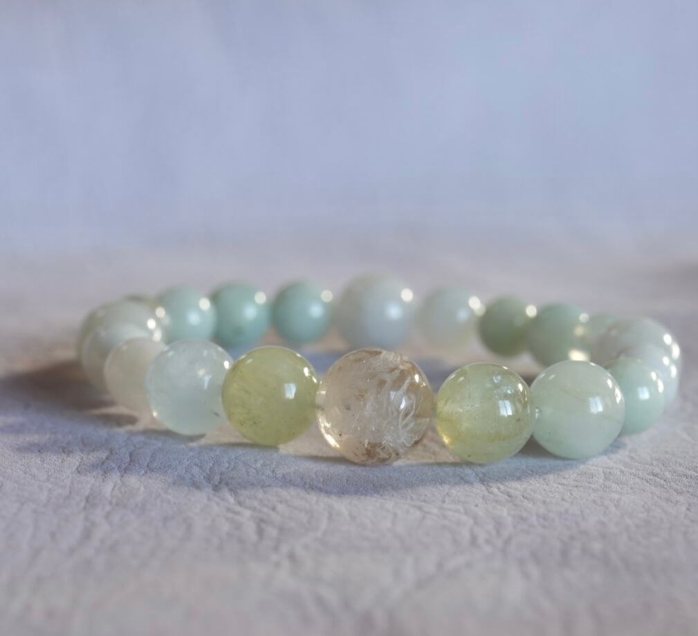 やわらかな翠色の翡翠に、涼やかな淡い緑のグリーンベリル、プレナイトの組み合わせで癒しカラーのブレスレットになりました。
