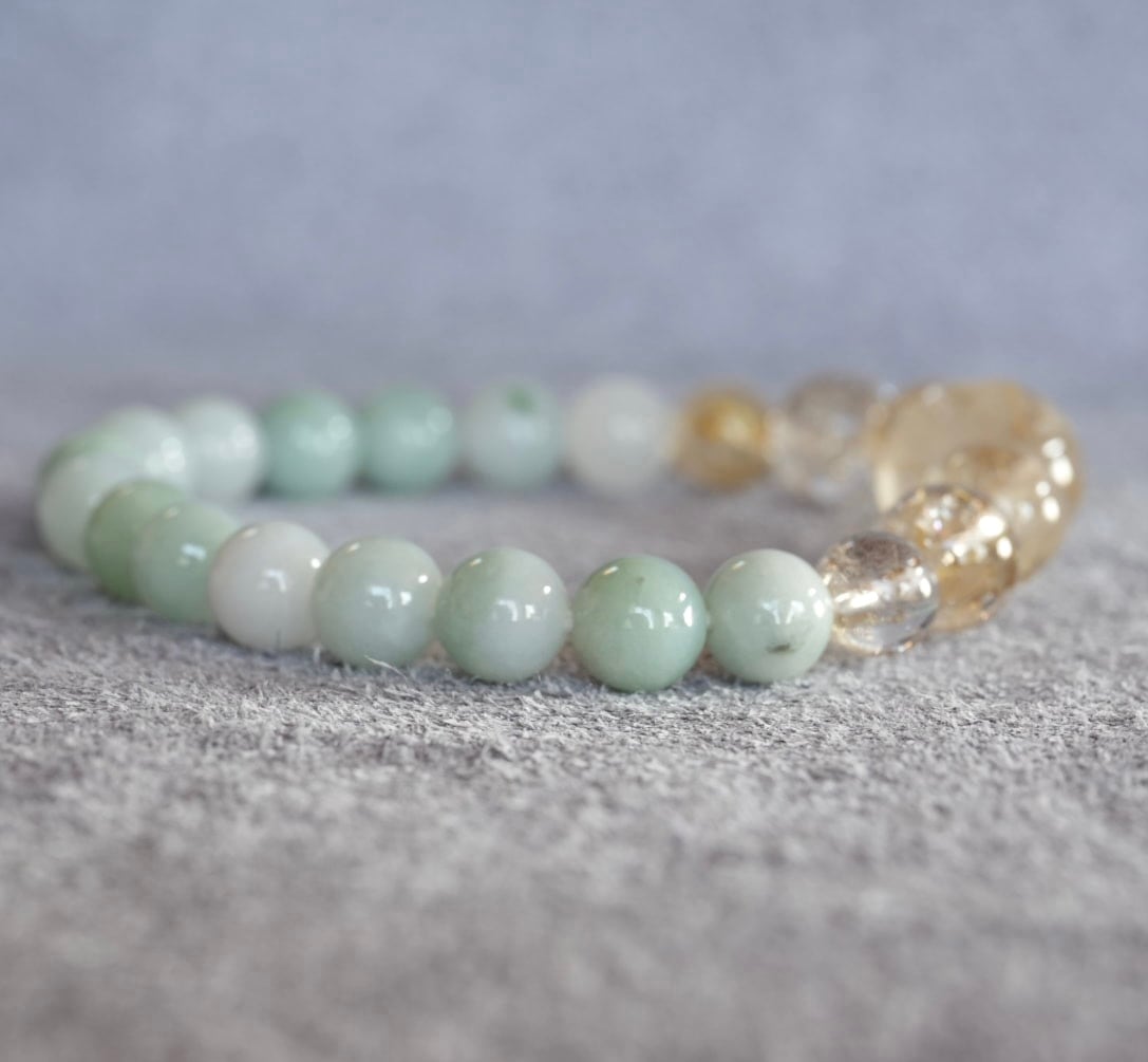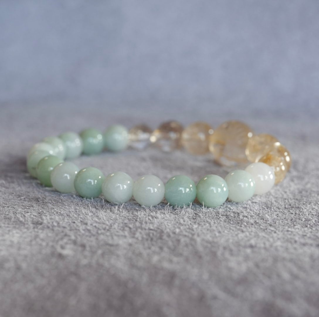 やわらかな翠色のビルマ翡翠、春の訪れを告げる新芽のような優しい色合いです。中央には手彫りの龍のゴールドルチルクォーツ、その横には透明感のある清々しいゴールドルチルクォーツを。