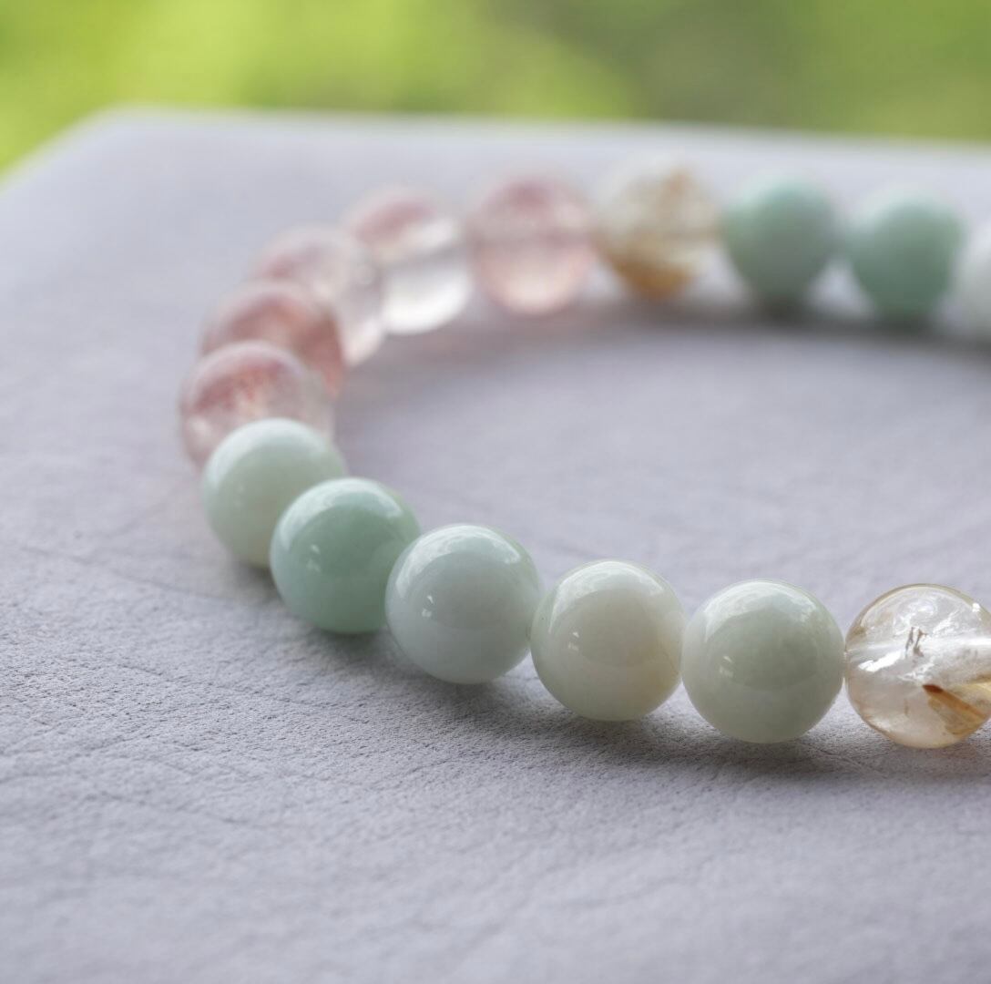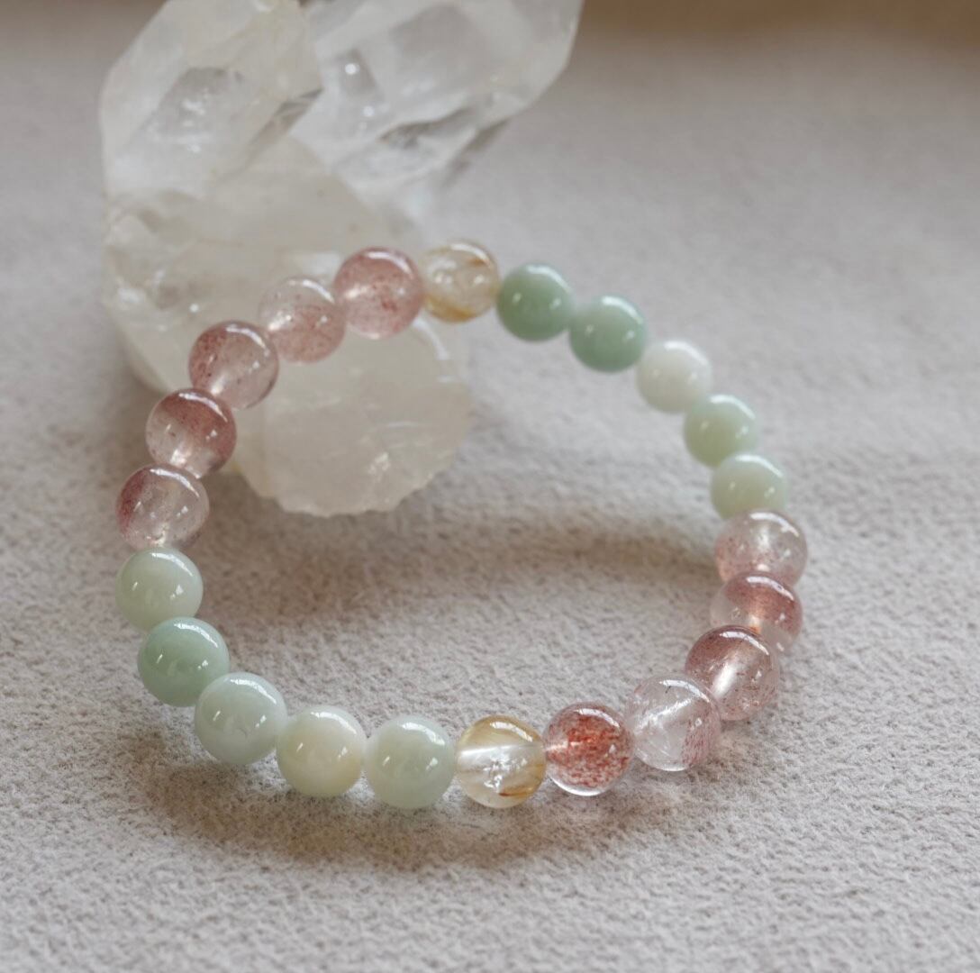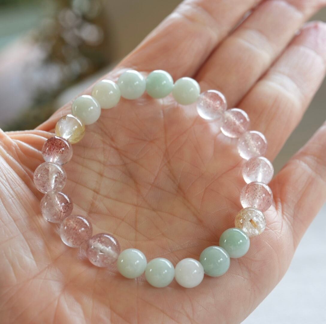 透明感のある可愛いピンクのストロベリークォーツに、新芽を思わせる淡い翠色の翡翠を合わせたブレスレットです。ゴールドルチルクォーツを加えて煌めきと金運もプラス。